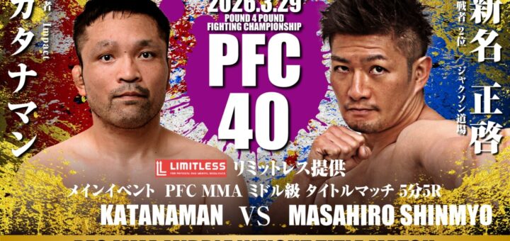ニュース 2026-03-11 by BOUTREVIEW · Published 2026-03-11 PFC 3.29 札幌 PODアリーナ:ミドル級王者 カタナマン、王座奪還&リベンジ狙う新名正啓と防衛戦。森永ユキトのバンタム級王座挑戦権懸け地元のジミー西将希と青木大地が激突