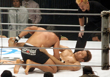 ◆ノゲイラ「菊田の寝技の巧さは聞いていたが、今日の試合で私の方が巧いと証明できたと思う。菊田はとても頭が良くて、非常に柔軟性の高い選手だ。一本を狙うタイプというより、防御は堅く、ポジショニングが凄くうまい選手だね。日本の選手は技術が高いので戦うのは好きだよ。 最後のパンチは狙ってたわけじゃないけど、当てるチャンスを待っていた。菊田の寝技の防御が優れていたので、途中から立ち技勝負に切り替えた。 今後はヒクソンや小川と戦ってみたい。彼らを倒して自分が世界一の選手であることを証明したい」