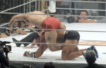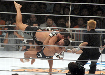 ※メインイベントの前にヒクソン・グレイシーがリングに登場。「ここ2年間いろいろな出来事があったけど、100%元気になりました。あとはリングの上で戦うだけです」と語り、近いうちの試合を復帰を表明した。ちなみに日テレの放送ではなぜかヒクソンの無敗記録が「450」にまで一気に伸びていた。