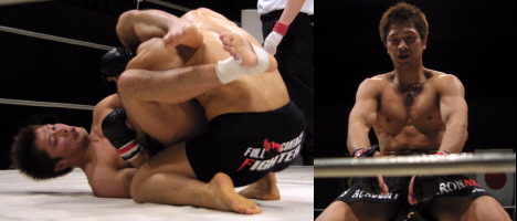 デビュー戦で大河内貴之相手に完勝した弘中の注目の第2戦。対する中山はレスリング出身だけあり片足タックルであっさり弘中をテイクダウンに成功する。だがガードポジションを取った弘中は再三に渡り三角絞めを狙い続ける。何度か凌いだ中山だったが遂にがっちりと捕まってしまった。勝った弘中は余裕のコマネチポーズ。弘中の将来性が感じられた一戦だった。