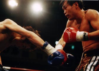 そして3R、ついに小出が鈴木を捕らえ、コーナーに追い込んでボディへの左フック連打。鈴木カウンターの左で難を逃れるがこれでリズムに乗った小出、4Rジャブにカウンターのローを合わせられるのもお構いなしに前進、焦りからかガードが下がり気味の鈴木を、またもコーナーに詰めて左ボディから顔面へ痛打。鈴木これを首相撲で凌ぐが流れは小出に。