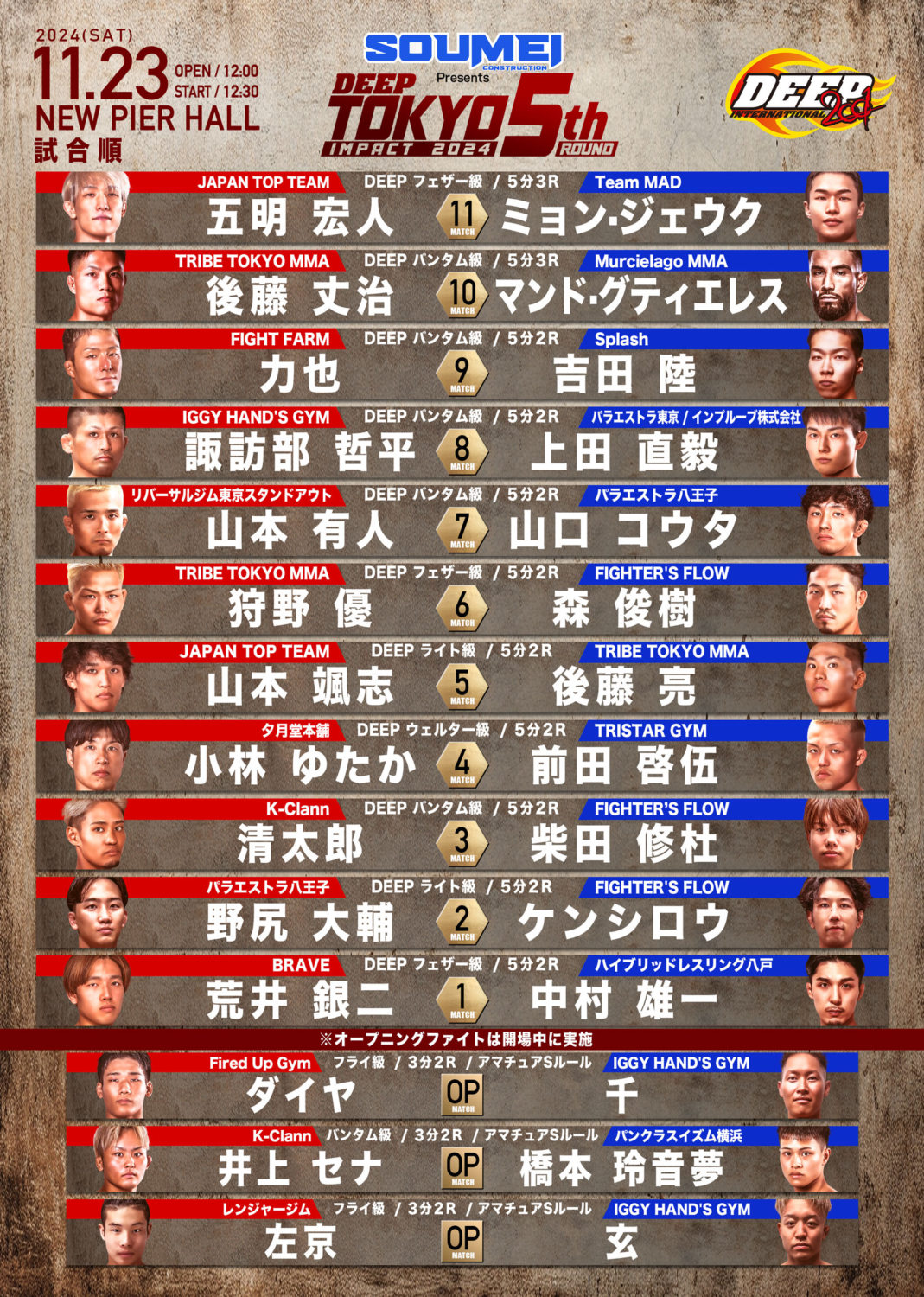 日時 2024年11月23日(土/祝)開場・12:00 オープニングファイト開始・12:10 開始・12:30