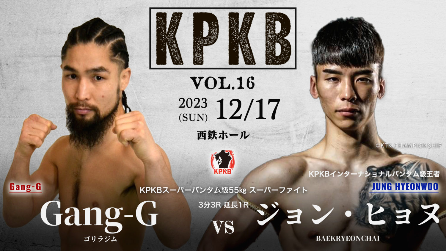 Vol.16のメインは、前回大会で日畑達也を1RKOで倒しKPKBバンタム級インターナショナル王者となったジョン・ヒョヌが登場。挑むのは九州で激闘を繰り広げるGang-G。破壊力抜群のパンチを持つジョン・ヒョヌをどう攻略するか。