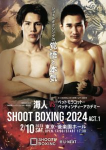 SHOOT BOXING 2024 act.1(2月10日(土)後楽園ホール)でシュートボクシング(SB)世界スーパーウェルター級(70kg)王者・海人が、元ONEムエタイ・フェザー級(70.3kg)王者のペットモラコット・ペッティンディーアカデミーと、肘有りのSBルールで対戦することが、12月22日の東京のU-NEXTオフィスでの記者会見で発表された。大会の模様はU-NEXTにて生中継される。 (会見写真提供:(C)SHOOT BOXING)