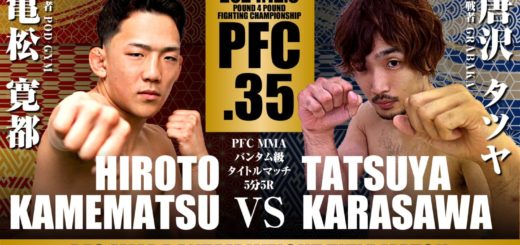 前回PFC.31にて今回のバンタム級タイトル挑戦者である亀松寛都(2位 / POD GYM)が、前哨戦で寝技の上手いジミー西をアッサリとリアネイキドチョークで下し、来場していた渡部修斗(王者 / FIGHT LYNX)へまさかの挑戦をぶち上げた!!亀松からの挑戦表明を受けた渡部はそれを受諾し、北海道でやり残したことをやるとPFCで一夜かぎりの復活を決意し、防衛戦の相手として亀松を迎え撃つこととなった。