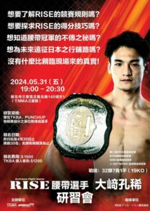 5月31日(金)台北市内・TMMA台北三重館にてRISEバンタム級王者 大﨑孔稀選手が台湾踢拳協會(TKBA)の選手達と技術交流会を行います。