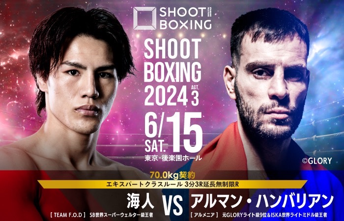 2024年6月15日(土)東京・後楽園ホールで開催される『SHOOT BOXING 2024 act.3』の記者会見が行われ、追加対戦カードが発表された。出場が決定していたSB世界スーパーウェルター級王者・海人(TEAM F.O.D)の対戦相手は、元GLORYライト級9位でISKA世界ライトミドル級王者のアルマン・ハンバリアン(アルメニア)に決定した。(記事提供:シュートボクシング協会 写真 (C)SHOOT BOXING)