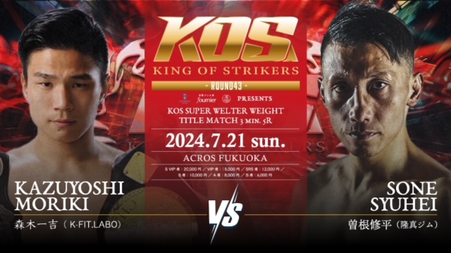 KING OF STRIKERS ROUND 43 ~ RAOU GYM 10周年~(7月21日(日)アクロス福岡)の対戦カードが発表された。今大会は福岡市中央区のRAOU GYM 10周年記念大会として開催される。