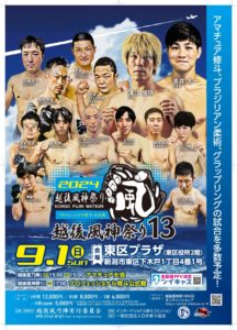 プロフェッショナル修斗公式戦「越後風神祭り13」(9月1日(日)新潟市東区プラザ)の対戦カードが発表された。4月に続き今年は2回目となる「越後風神祭り」。前回メインイベントで岡田達磨相手に大流血の末に2R逆転KO勝ちした、富山出身の澤江優侍が連続出場し、神奈川の心技舘に所属する青井太一を迎え撃つ。青井は今年に入り2連続KO勝ちしていたが、5月のニューピア大会では齋藤翼に判定負けしている。