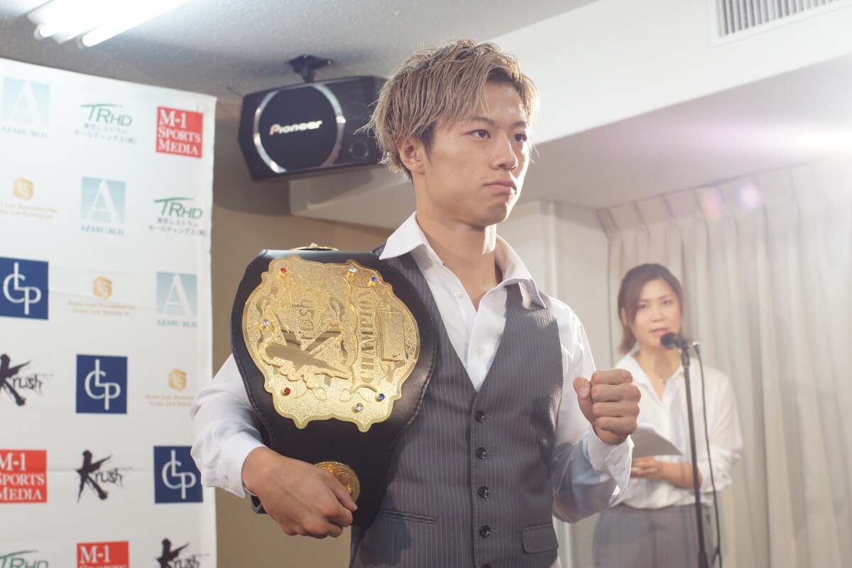 金子は6戦6勝(3KO)の21歳。6月30日のKrush.89では軍司泰斗との延長戦の末、右ストレートでダウンを奪って判定勝ちし、ベルトを奪取した。