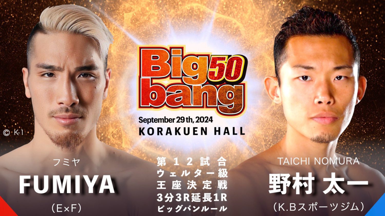 野村はBigbangで元王者の山際和希、大輝に敗れ、昨年後半のBigbangでは栗原陵と松山翔に連勝したが、2月のRISEでは麻火佑太郎に判定負けした。6月大会にも出場予定だったが負傷欠場していた。