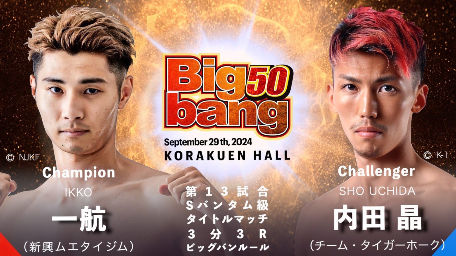 一航は昨年12月のBigbang横浜武道館大会で小巻海斗に判定勝ちして以来となるBigbang王座の防衛戦。今年2月のNJKF同級王座決定戦で真琴に判定負け、4月のONE Friday Fightsでラオス人のペットナムコンにダウンを奪われ判定負けし連敗していたが、7月のONE Friday Fightsではタイ人のBMに2R右ストレートでKO勝ちし35万バーツ(約150万円)のボーナスを獲得した。NJKF 11.10 後楽園大会から開幕する55kgトーナメント「KICKBOXING JAPAN CUP 2024」にもエントリーしており、Bigbang王座防衛戦を無事クリアしたいところだろう。