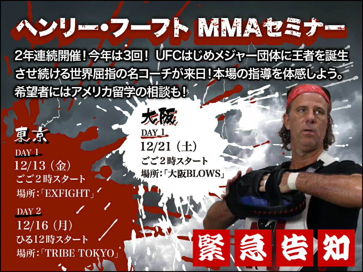 このたび支援を決定したMMAセミナーでは、昨年同様ヘンリー・フーフト氏が、原則としてプロファイターを対象に、世界各国で実施しているセミナーおよびレッスンをそのまま日本で開催。東京と大阪での実施が決定しており、東京は12月13日(金)と12月16日(月)、大阪は12月21日(土)にそれぞれ行います。ヘンリー・フーフト氏は、プロファイターとして活躍後トレーナーとしてのセカンドキャリアを詰むと、現在はMMAの本場・アメリカの名門ジム「Kill Cliff FC」のヘッド・コーチを務めています。