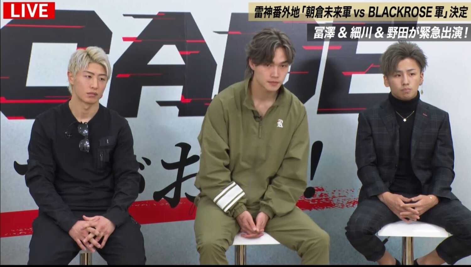 『RIZIN DECADE』の開催まで残り10日を切った12月22日(日)に、「ABEMA」 で生放送した特別番組『12.31 RIZIN大晦日【緊急!アベマSP特番】』には、RIZIN CEOの榊原信行氏と、日本格闘技界の盛り上げ隊長である元格闘家で解説者の大沢ケンジさんが登場。さらに、同日行われた『RIZIN DECADE』の会見にて、新たに発表された「雷神番外地」に出場が決まった朝倉未来軍の冨澤大智選手、細川一颯選手、野田蒼選手、そして平本蓮選手率いるBLACK ROSE軍の篠塚辰樹選手、朝久泰央選手、宇佐美正パトリック選手も緊急出演しました。