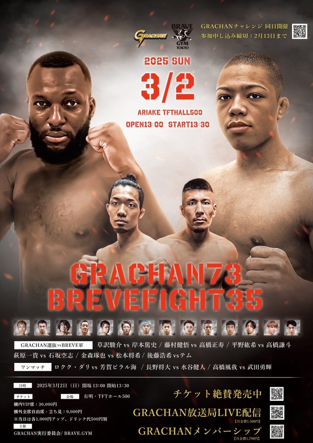 GRACHAN 73 × BRAVE Fight 35(3月2日(日)東京・有明 TFTホール500)の開催が迫っている。主催者からはプロ9試合の見所紹介と、トレイラー映像が届いている。大会の模様はYoutube GRACHANチャンネル メンバーシップ(月1,790円)、GRACHAN放送局(月1,500円)にて生中継される。