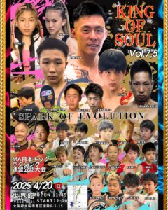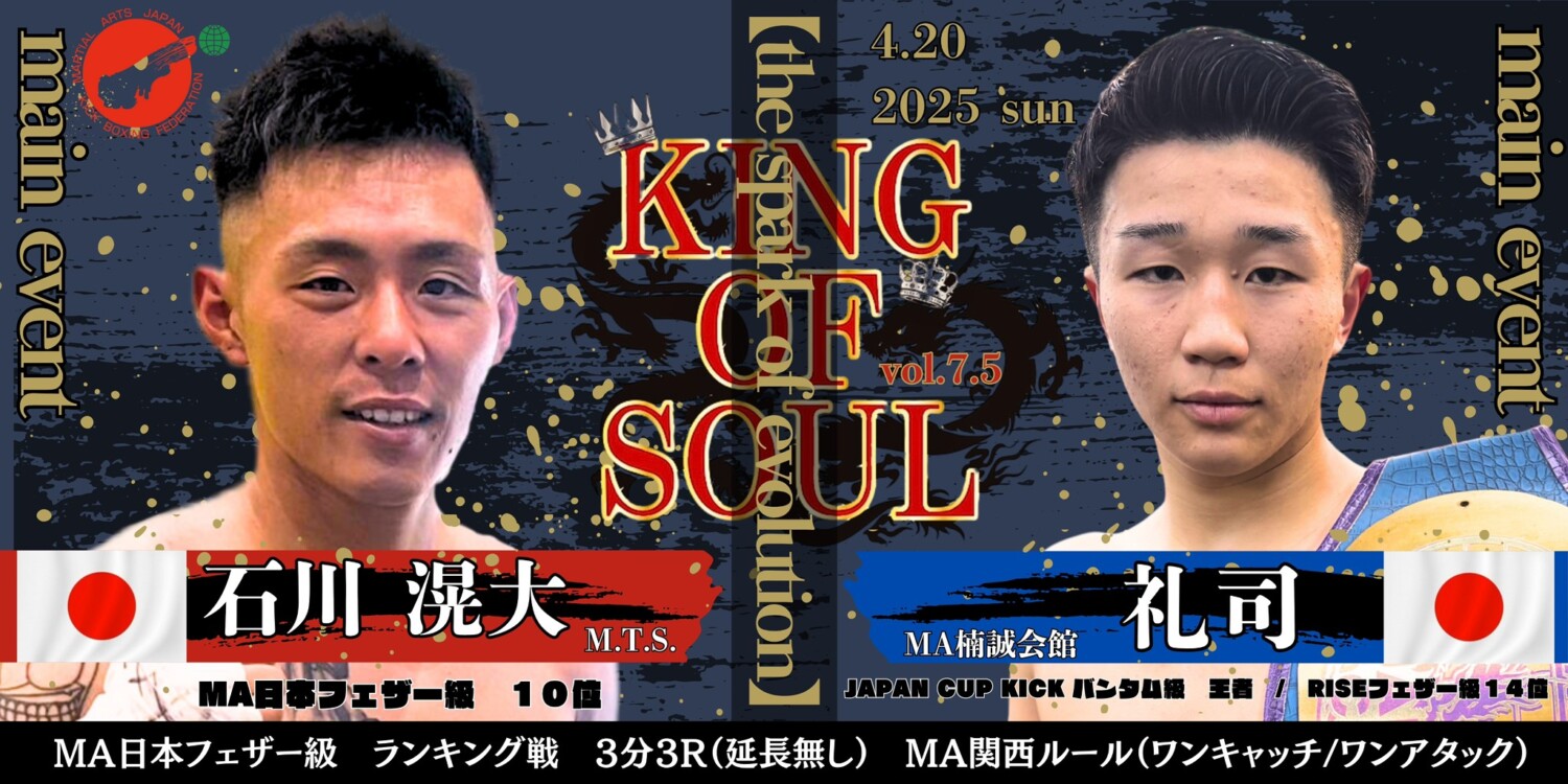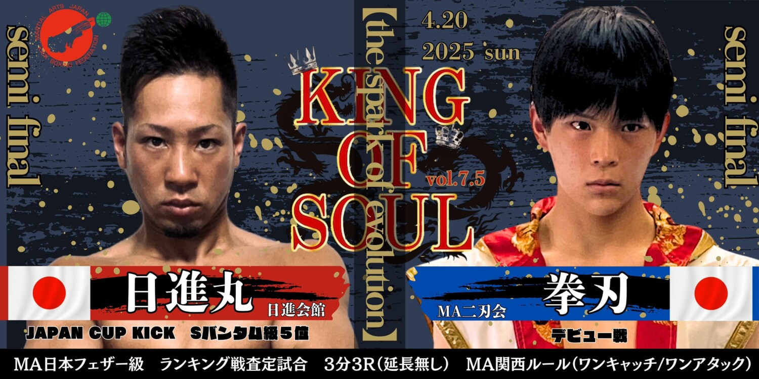 2025年4月20日(日)大阪・世界館にて開催されるMA日本キックボクシング連盟公認大会『KING OF SOUL:vol.7.5【the spark of evolution】』の全対戦カードが発表された。今大会はMA日本キックの本シリーズ『KING OF SOUL』のサブ大会となり、新人やこれからの活躍が期待される選手たちをメインにした登竜門大会となる。(記事提供:MA楠誠会館/MA二刃会)