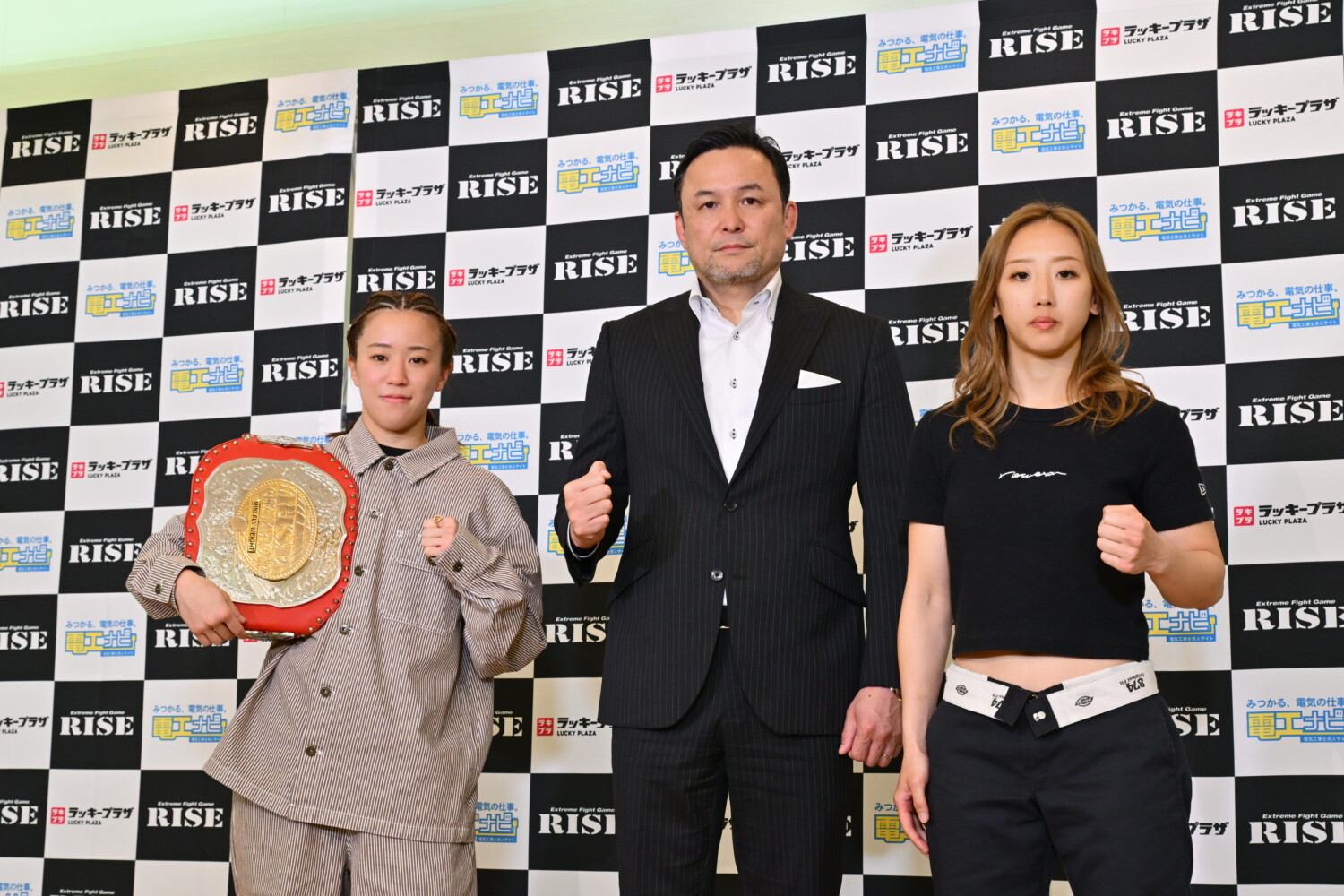 RISE FireBall NAGOYA(5月11日(日)ポートメッセなごや 第三展示館)の公式計量が前日10日、名古屋市内のホテルで行われ、全選手が1回でクリアした。この記事ではセミファイナルのRISE QUEENミニフライ級(49kg)タイトルマッチで対戦する王者の小林愛理奈と挑戦者の宮本芽依の談話をお届けする。チケットは完売。大会の模様はABEMAで生中継される。