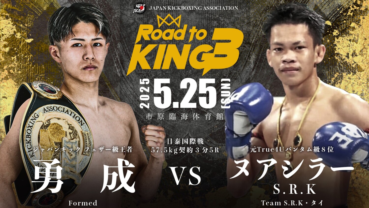 メインイベントでは昨年11月の後楽園大会にてジャパンキック・フェザー級王者となった勇成(Formed)が、元True4Uバンタム級8位のヌアシラーS.R.K(タイ/Team S.R.K)と対戦する。勇成は2月のONE Friday Fights 97に初参戦しグランプリノイ(タイ)に1R KO勝利しパフォーマンスボーナスの35万バーツ(約160万円)も獲得した。勢いに乗る福岡の若き王者・勇成が市原大会のメインに登場しどんなファイトを見せるか注目だ。