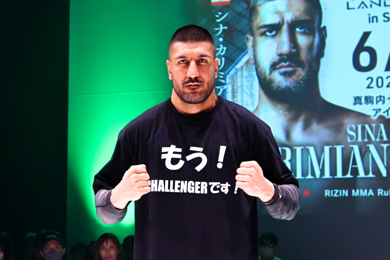 MMAデビュー戦となるカリミアンはタックルからのテイクダウン、パウンドや肘の動きも披露。「RIZINのヘビー級ベルト、後で」と日本語で話し、将来的にこのベルトを狙う方針を示した。
