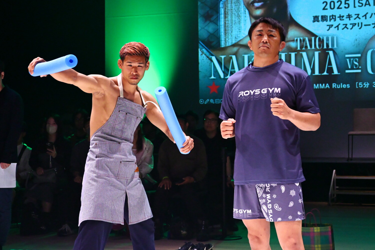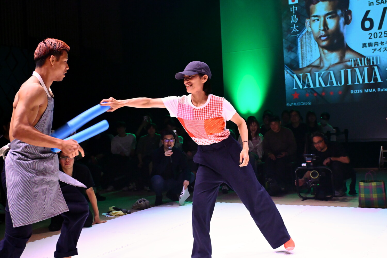 COROは夫人でRIZIN女子スーパーアトム級王者の伊澤星花とグラップリングのスパーリングを披露したが、攻め込まれ続け、最後はツイスターを極められタップアウト。中島も元フェンシング部だという夫人を呼び寄せ、夫人が振り回すウレタンスティックをかわすボディワークを披露し、最後はチャンバラを見せた。