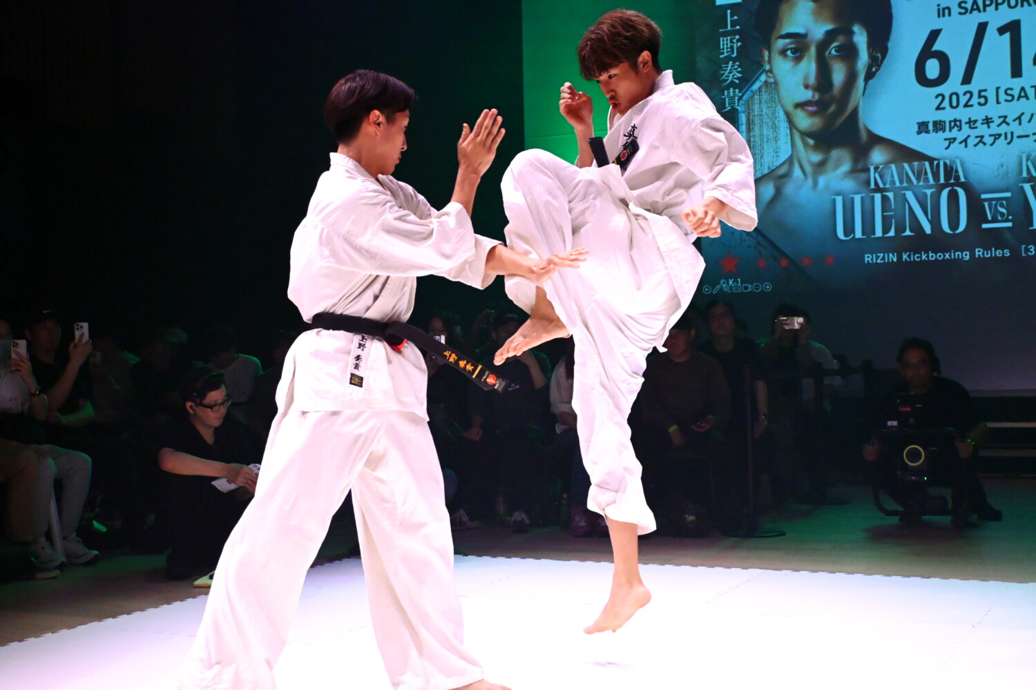 地元北海道大会に揃って登場する上野兄弟は空手着を着て、フルコンタクト空手形式のスパーリングを披露。兄の空大は「北海道のRIIZNをK-1を代表してしっかり盛り上げたい」、弟の奏貴は「K-1を代表して必ずRIZINの舞台でK-1の強さを証明していきます」と意気込みを語った。