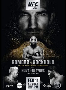 UFC 221: Romero vs. Rockhold(2月11日(日) オーストラリア・パースアリーナ)には日本から廣田瑞人、石原“夜叉坊”暉仁、阿部大治が参戦する。3選手とも揃って午前8時30分(同日日本時間)からのアーリープレリムに登場。DAZNではメインカードはもちろん、彼らの3試合も放送する。(10時開始のプレリム4試合はUFCファイトパスで生配信されるが、DAZNでは放送されない)