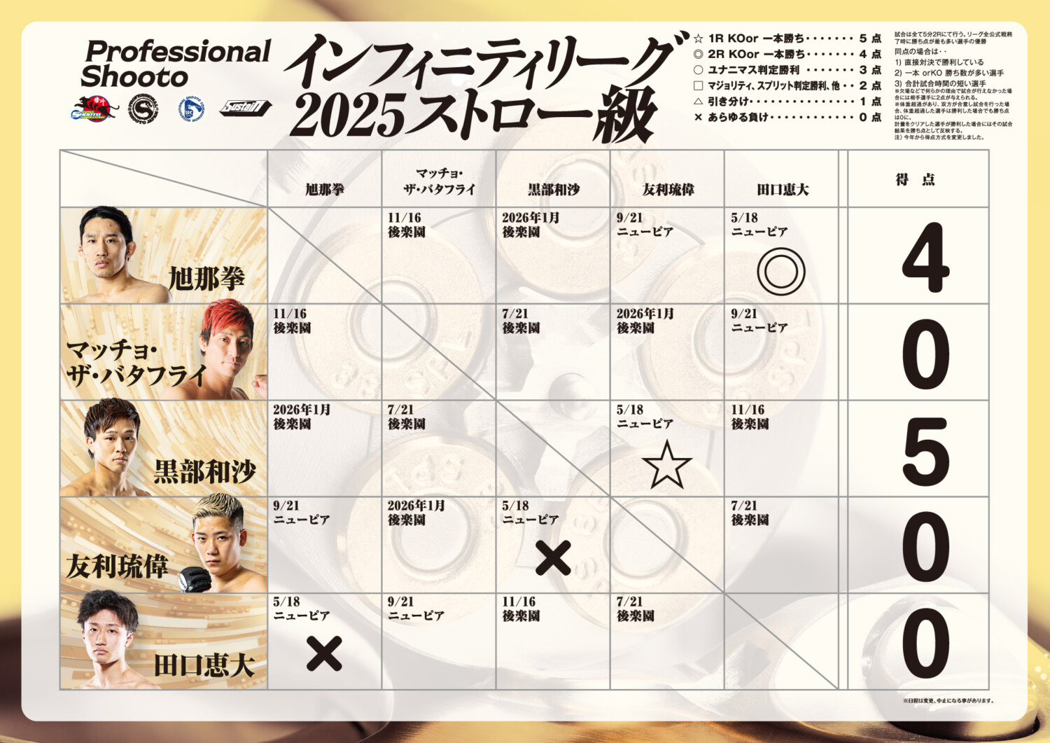 これを受け、友利選手から1R一本勝ちを収めた黒部選手には勝ち点5が与えられる事となります。