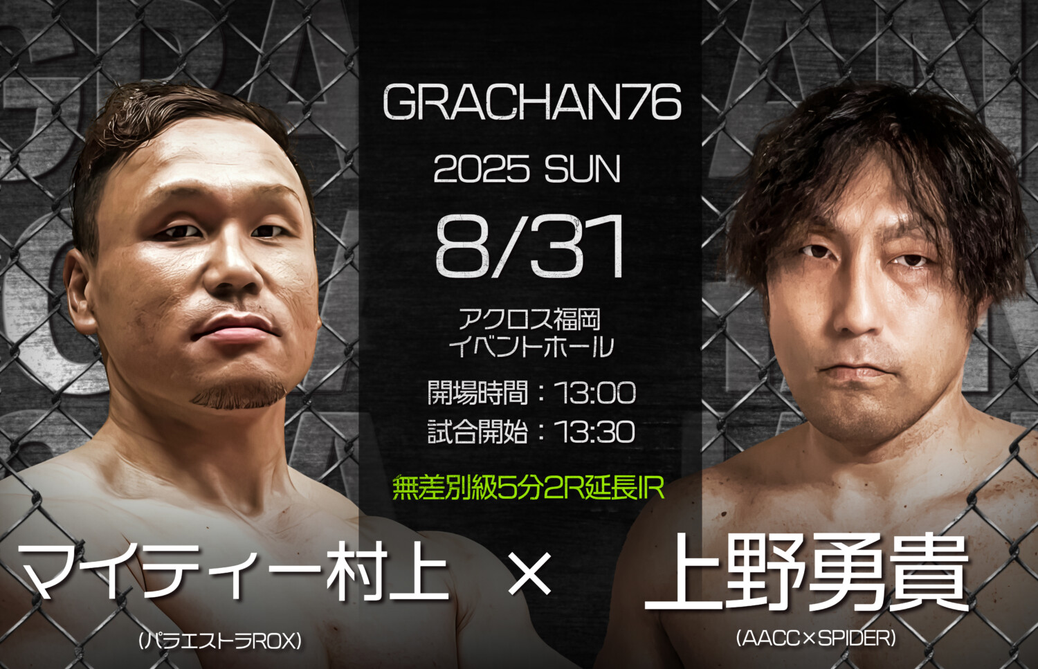 2025年8月31日(日)、アクロス福岡イベントホールにて「GRACHAN76」を開催いたします。今大会は、全国の実力派ファイターが一堂に会し、団体や階級、世代を超えた熱戦が繰り広げられます。(記事提供:GRACHAN)