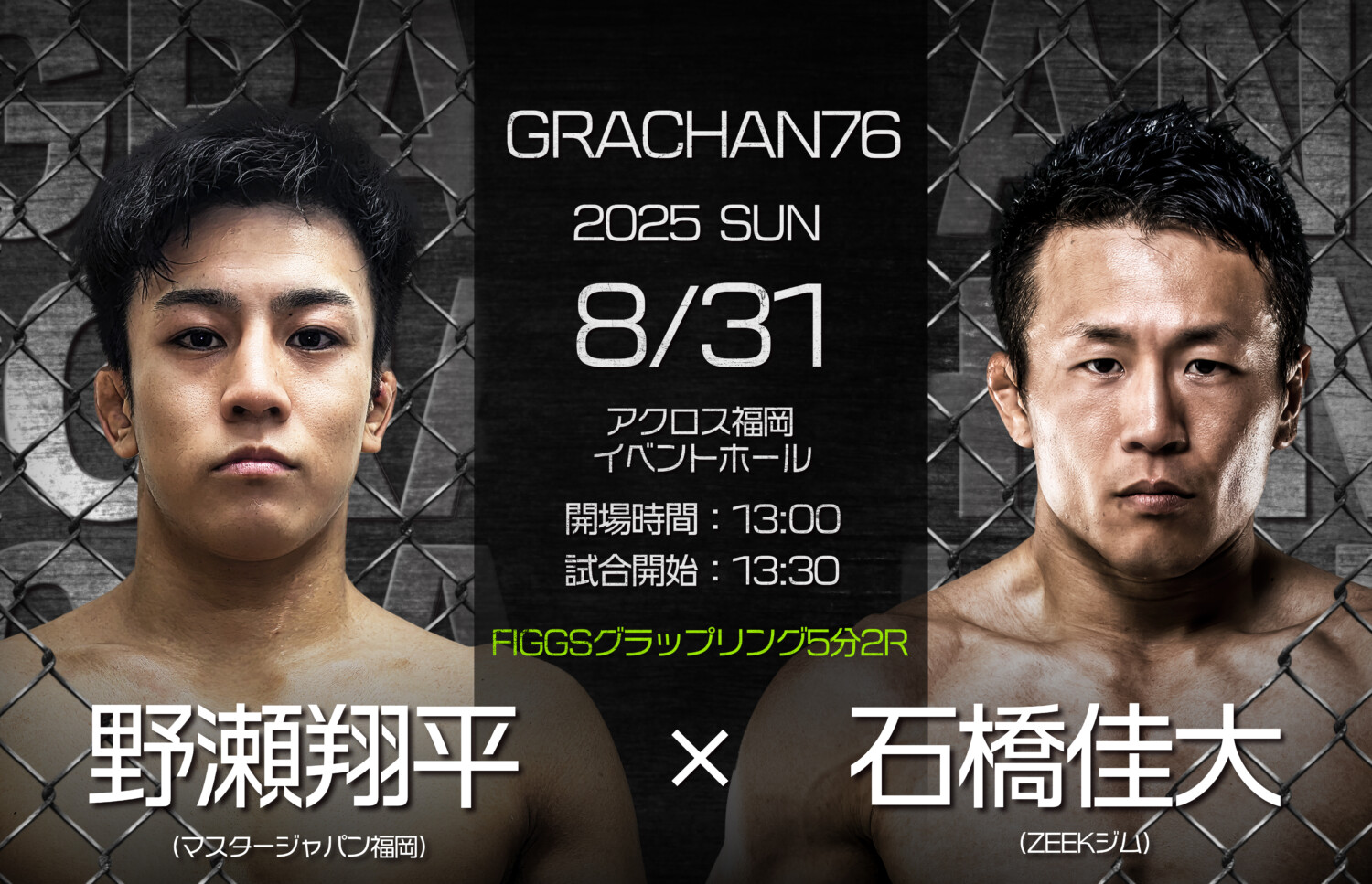 GRACHAN 8.31 アクロス福岡:GRACHAN 徳弘拓馬×修斗 野尻定由 バンタム級ランカー対決。野瀬翔平×石橋佳大のグラップリング戦も