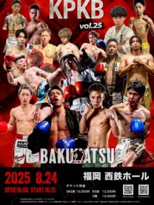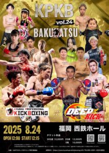 KPKB(九州プロキックボクシング)vol.24 & 25(8月24日(日)福岡・西鉄ホール)の対戦カードが発表された。大阪を拠点とするDEEP☆KICKとの交流戦を盛んに行っているKPKBだが、今回の昼の部のvol.24は全8試合(アマチュア4試合含む)がDEEP☆KICKとの交流戦として行われ、KPKB新旧王者の川森悠人・日畑達也・幸輝らが迎え撃つ。