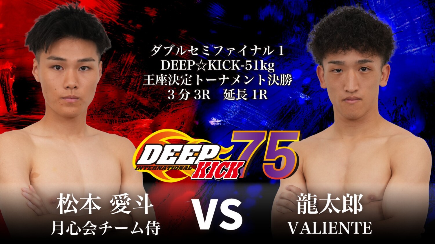 DEEP☆KICK-51kg第5代王者を懸けたトーナメントの決勝戦。7月の準決勝を勝ち上がってきた同級1位の松本愛斗(月心会チーム侍)と同級2位の龍太郎(VALIENTE)がその座を競う。