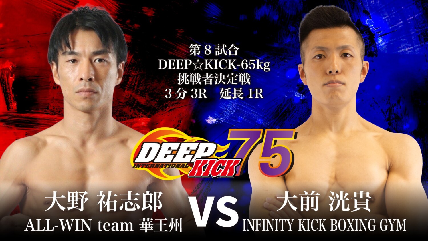 昨年12月にDEEP☆KICK-65kg第6代王者に輝いたTETSU(月心会チーム侍)の初防衛戦の挑戦権を懸けて大野祐志郎(ALL-WIN team 華王州)と大前洸貴(INFINITY KICK BOXING GYM)が競う。