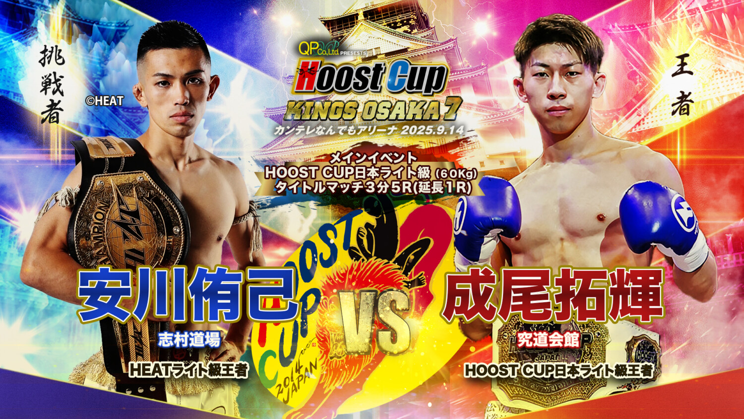 HOOST CUP KINGS OSAKA 7 ~BURNNING ! OSAKA~(9月14日(日)大阪・関西テレビなんでもアリーナ)の主要カード3試合が発表された。主催者から各試合の見どころ紹介が届いている。