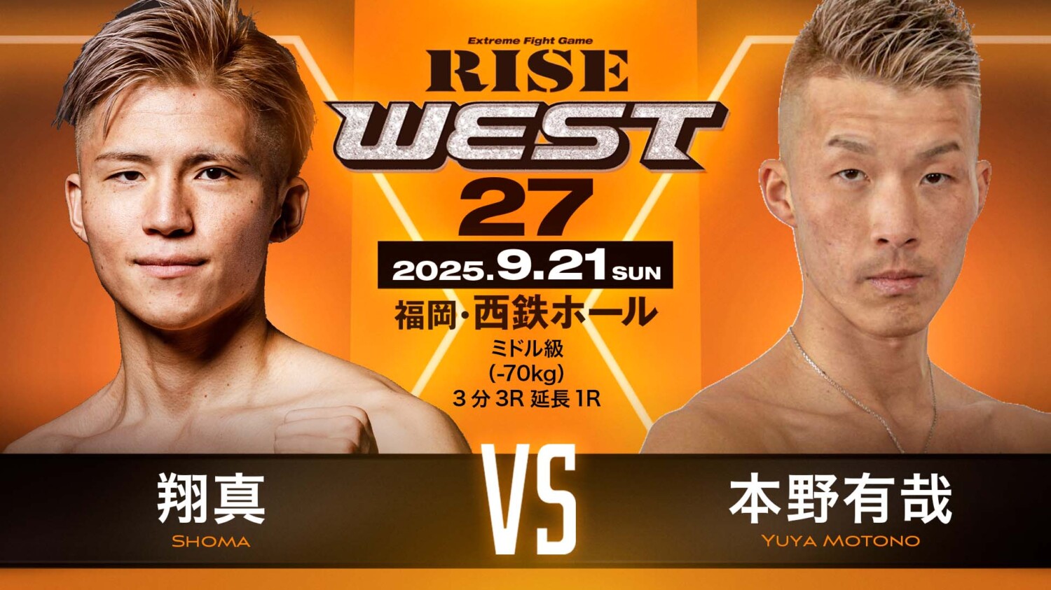 RISE 9.21 福岡 西鉄ホール:地元ミドル級ランカーの翔真、5戦全勝のDEEP☆KICK-70kg新王者 本野有哉と対戦