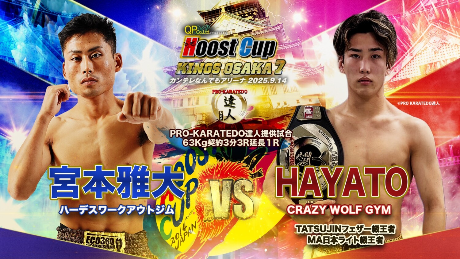 空手の可能性を追求する団体「PRO-KARATEDO達人」の提供により、TATSUJIN王者HAYATOが参戦。HAYATOは“空手天才児”と呼ばれ、フルコンタクト空手で数々のタイトルを獲得。キックボクシングでは、アクセル王者でもあった横山剛が率いるCRAZY WOLF GYM所属として活躍している。今年1月の「PRO-KARATEDO達人」大会では、NJKFトップランカー祖父江泰司との王座決定戦を制し、TATSUJINフェザー級タイトルを獲得した。