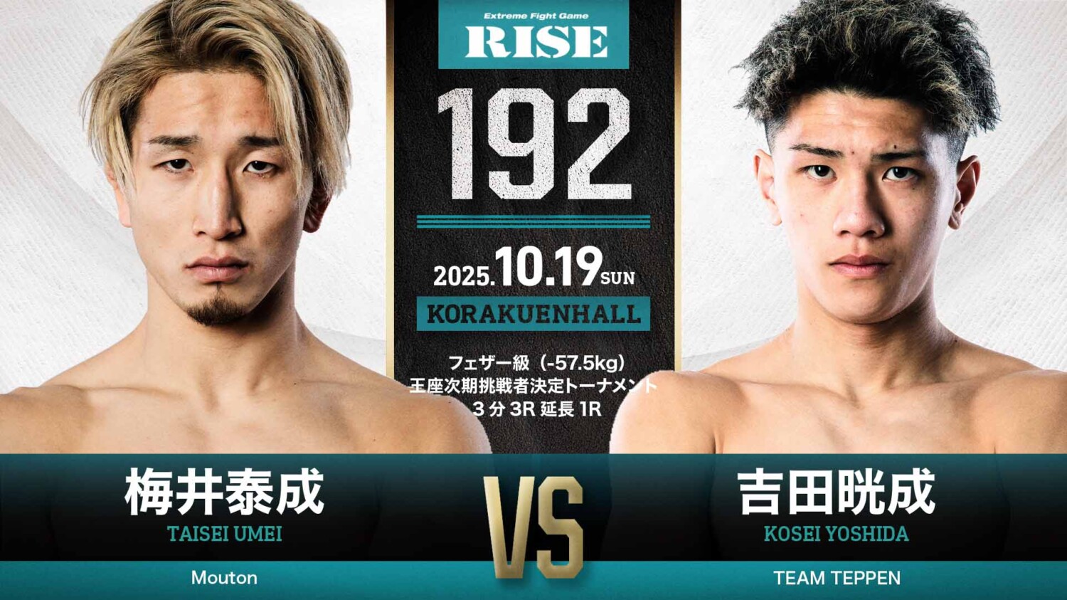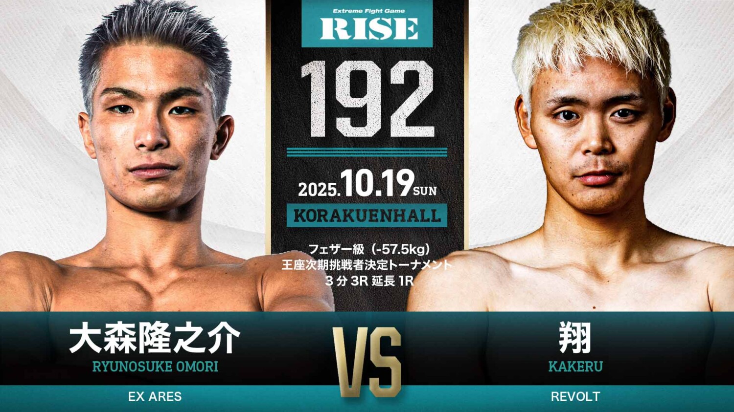 RISE 192(10月19日(日)後楽園ホール)で、安本晴翔が保持するRISEフェザー級王座への挑戦者を争う4選手参加のトーナメントが開幕する。一回戦の組み合わせはバンタム級1位でもある大森隆之介(4位)vs. 2連勝中の翔[かける](6位)、元王者の梅井泰成(3位)vs. 5戦全勝の19歳・吉田晄成(15位)に決まった。