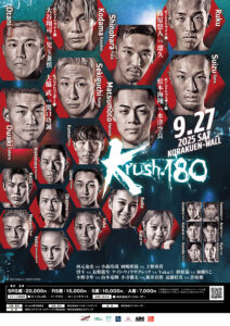 Krush.180(9月27日(土) 後楽園ホール)の関口功誠[こうせい](ALONZA ABLAZE)と対戦予定だった椿原龍矢(月心会チーム侍)が、練習中に負傷し、中節骨骨折と診断されドクターストップとなったため、今大会を欠場する。代わって大脇武[たける](BOND GYM)が出場し関口と対戦する。階級はフェザー級で変わらない。