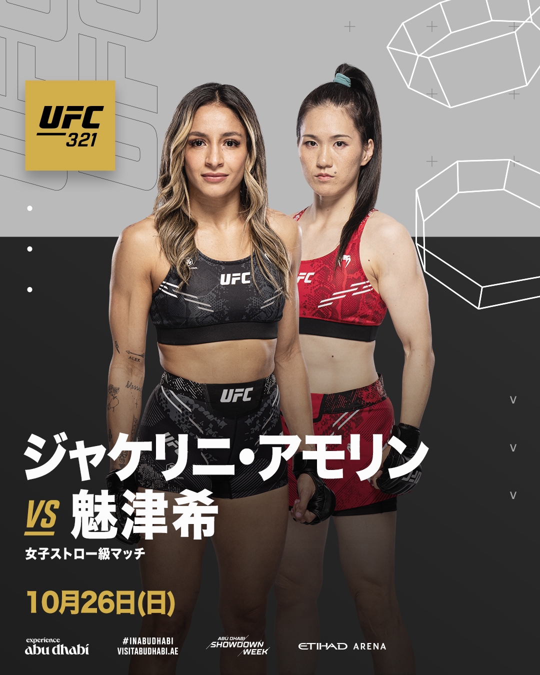 UFC 321: Aspinall vs. Gane(10月25日(土/現地時間)UAEアブダビ:エティハドアリーナ)に魅津希[みずき](セラ・ロンゴ・ファイトチーム)が出場し、ジャケリニ・アモリンと対戦することが発表された。階級は女子ストロー級。