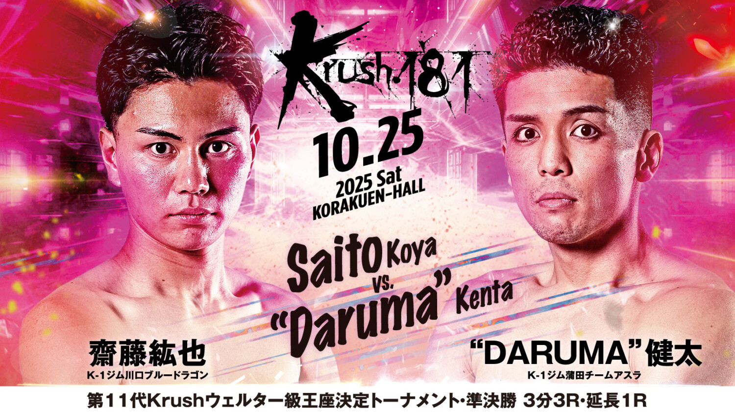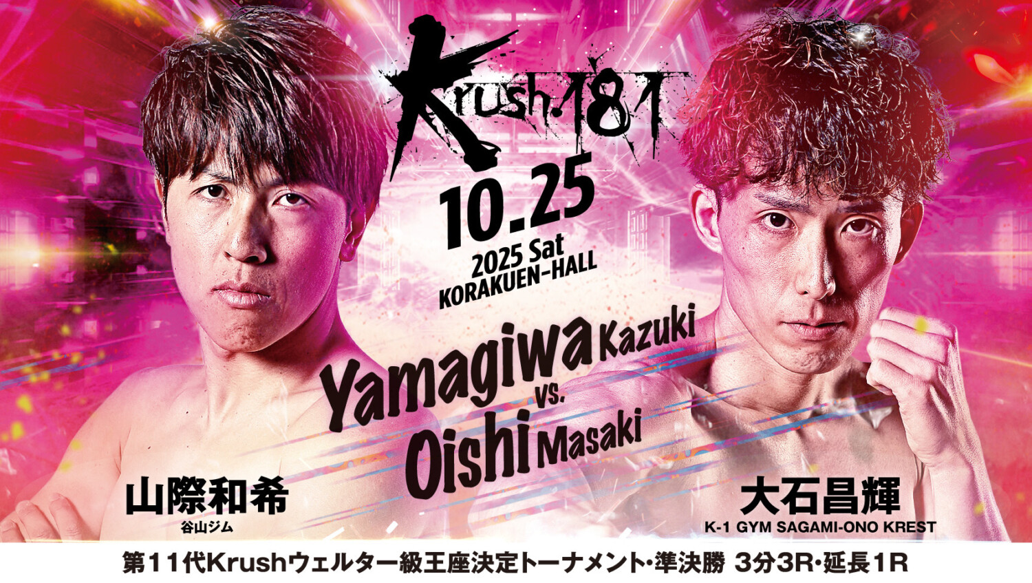 Krush.181(10月25日(土)後楽園ホール)の対戦カードが発表された。8月23日のKrush.179で開幕戦(一回戦)の行われた「第5代Krushフライ級王座決定トーナメント」の準決勝が行われる。22年に寧仁太・アリの返上したKrushウェルター級王座の第11代王者を決めるトーナメントが4選手参加で開幕し、今回準決勝2試合が行われる。決勝は2階級とも12月19日のKrush.183で行われる。