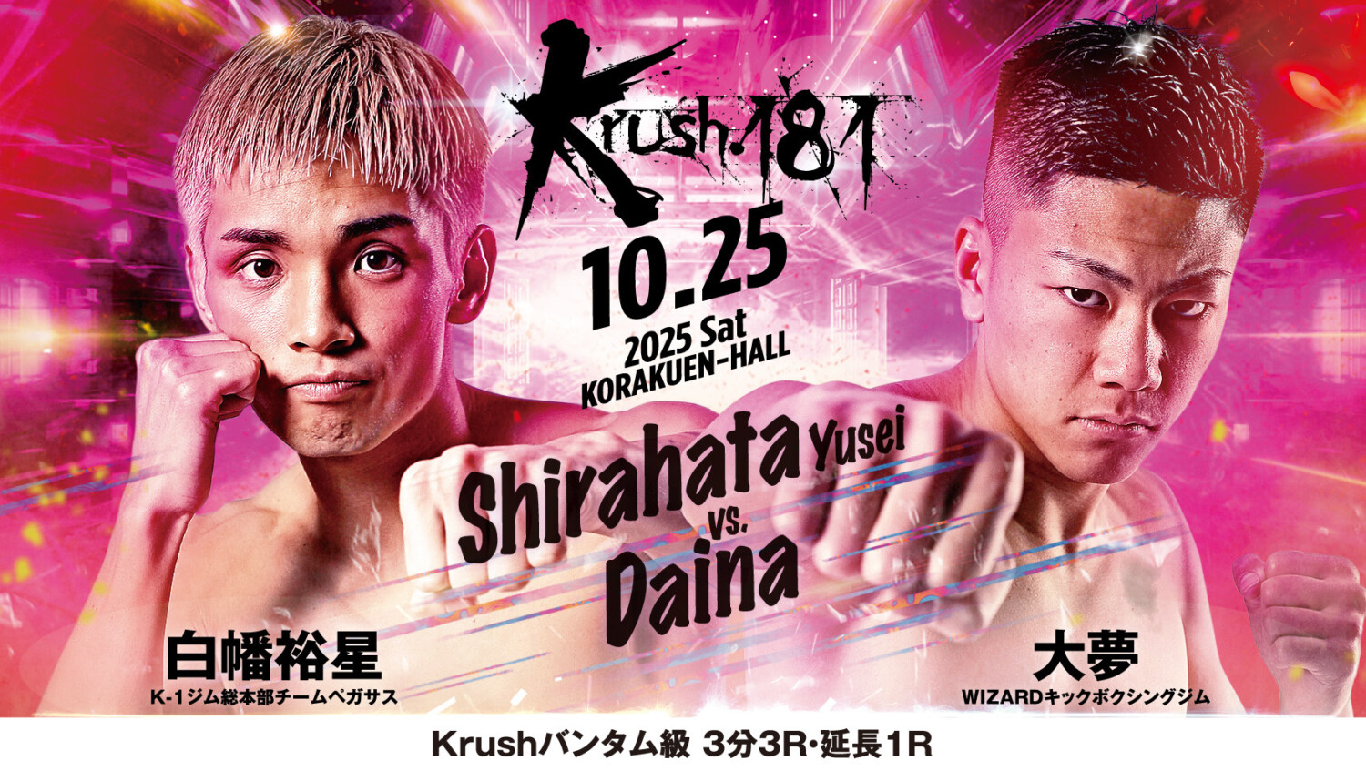 バンタム級では7月のK-1福岡大会で石井一成と延長に及ぶ接戦を繰り広げ惜敗した白幡裕星が、3月に黒川瑛斗のKrushバンタム級王座に挑戦しKO負けした大夢[だいな]、と対戦する。