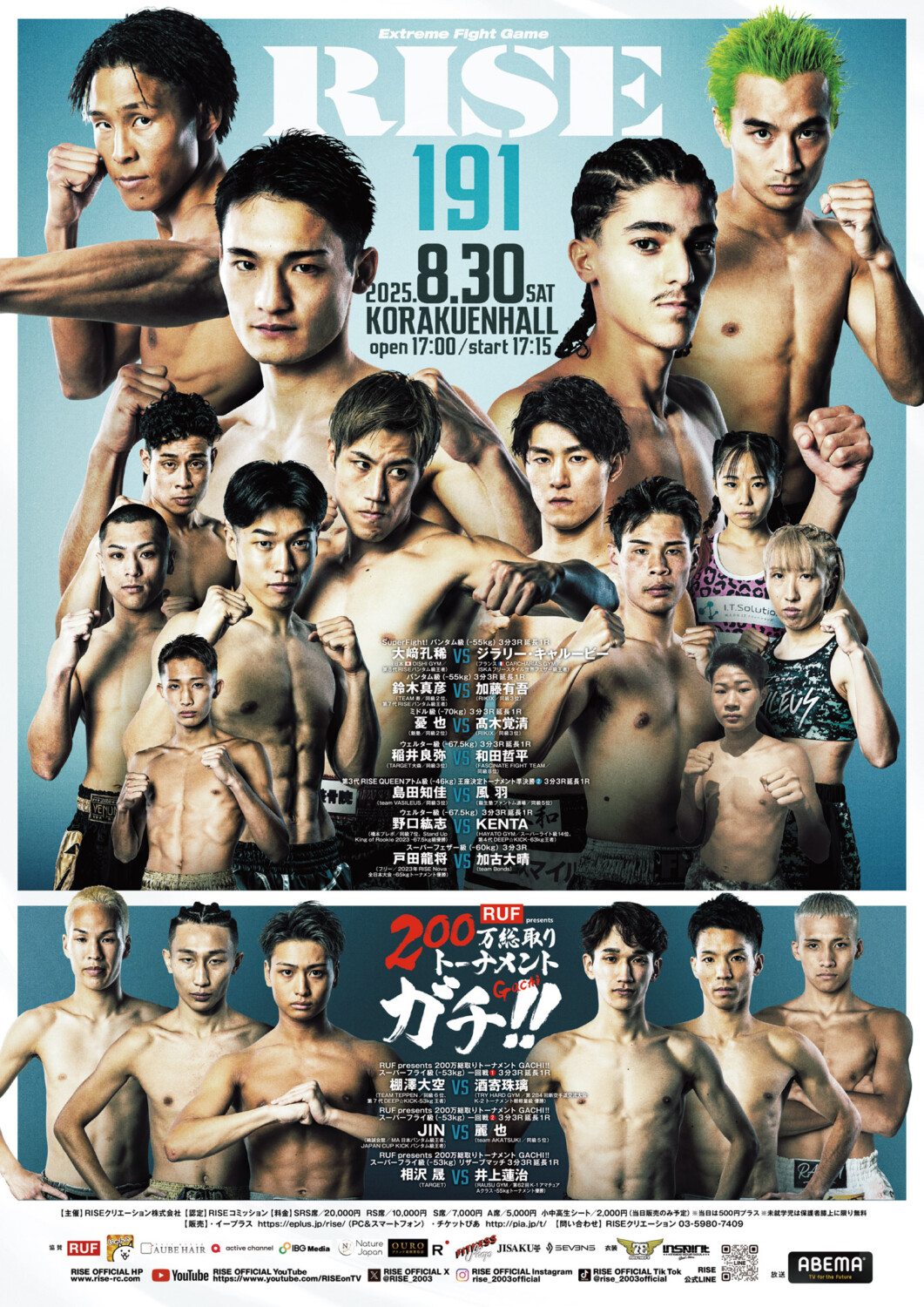 RISE 8.30 後楽園ホール:GACHI!!スーパーフライ級出場、7戦全勝の18歳 棚澤大空「勝って次のステージに進む」、JIN「決勝は両方ボコボコの状態で潰し合うので楽しみ」。憂也と戦う髙木覚清「崩しからの攻撃は“こけし”です」。島田知佳×風羽談話も