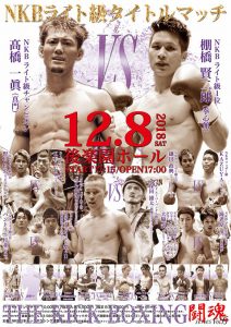 NKB 日本キックボクシング連盟「2018闘魂シリーズ ファイナル」(12月8日(土)後楽園ホール)の対戦カードが発表された。KNOCK OUTで町田光に勝利し、8月にヨードレックペット・オー・ピティサック相手に健闘した高橋一眞が、ホームリングのNKBに戻り、NKBライト級王座の防衛戦を行う。挑戦者の棚橋賢二郎も最近は他団体に乗り込み、7月の新日本キックでは高橋亨汰に肘で切られ1R TKO負けを喫したが、9月のINNOVATIONでは櫻井健に判定勝ちしている。高橋も棚橋も他団体での経験で成長した姿を、今年ラストのNKBの大会のメインで示してくれることだろう。