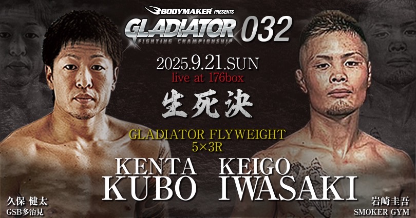 前回 フライ級挑戦者決定戦にて今井健斗選手に敗戦となった久保健太選手は、アマチュアGLADIATOR生え抜き無敗の岩崎圭吾選手の熱い希望を受けて対戦が決まりました。ベテランの強さを見せることが出来るか、また若手の世代交代となるか。注目の新旧対決となりそうです。