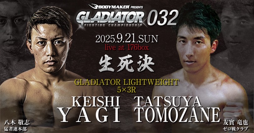 格闘DREAMERSにも出場しGLADIATORライト級戦線にて継続的に出場している八木敬志選手がPOUNDOUTに出場からGLADIATOR凱旋。友實竜也選手と対戦が決まりました。両選手共にパワーを駆使した試合運びが見所故展開ある試合を期待したい一戦です。