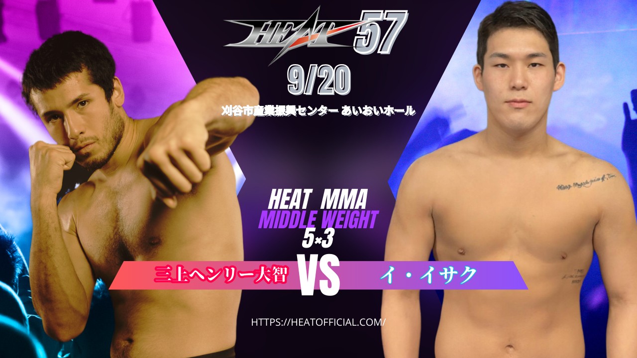 HEAT 57(9月20日(土)愛知県刈谷市産業振興センター)の全カードが決定した。MMAミドル級では三上ヘンリー大智(EXFIGHT)vs. イ・イサク(韓国/コリアントップチーム)が決定した。
