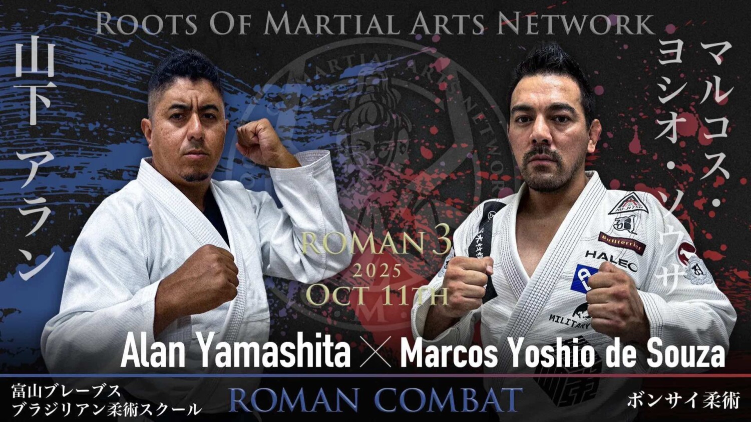 ROMAN主催「ROMAN 3」(10月11日(土)東京・GENスポーツパレス)の対戦カード第一弾が発表された。ROMANは昨年3月に設立され、CEOの渡辺直由、名誉顧問の中井祐樹、実行委員会代表の弘中邦佳といった、柔術・MMAの黎明期を支えた名選手たちが運営に携わっている。昨年10月に旗揚げ大会、今年4月に第2回が行われ、今回が3回目。過去の大会では渡慶次幸平、関根“シュレック”秀樹のバーリトゥードマッチが話題を呼び、第2回では日沖発×アレッシャンドリ・フランカ・ノゲイラというゼロ年代の修斗世界フェザー級王者たちによる道着着用MMA(ROMAN COMBAT)も行われた。