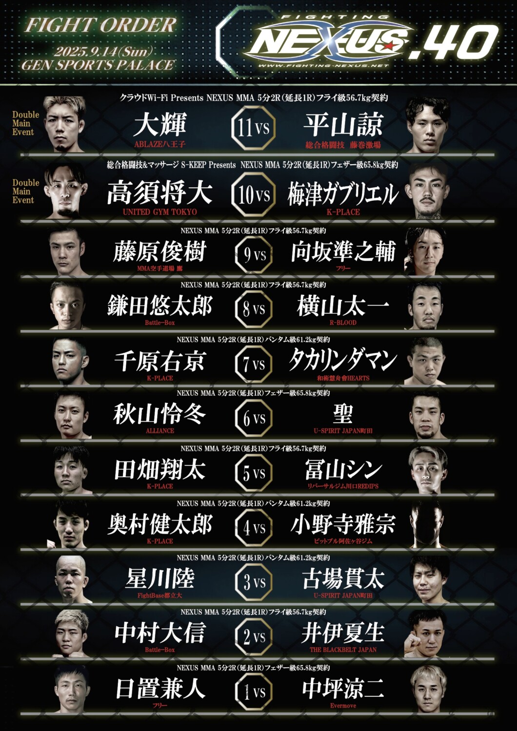 Fighting NEXUS vol.40(9月14日(日) 東京・GENスポーツパレス)の対戦カードが発表された。