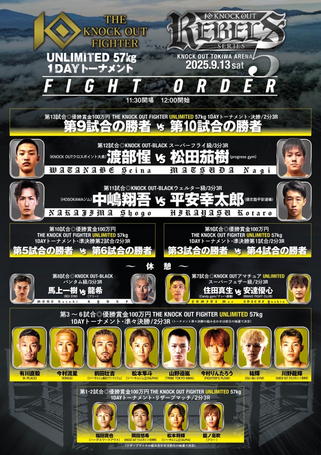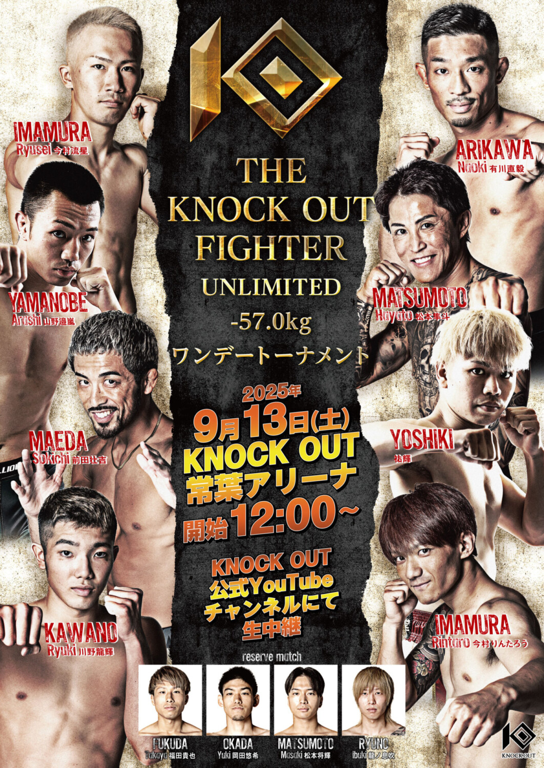 「優勝賞金100万円 THE KNOCK OUT FIGHTER UNLIMITED 57kg 1DAYトーナメント」ではムエタイルールをベースに倒れた相手に対してのパウンドやサッカーボールキックも認める、KNOCK OUT-UNLIMITEDルールが採用されるため、MMA・キック双方の選手がこのルールに挑戦している。これまでのトーナメントはプロデビュー予備軍からデビュー間もない選手が主体だったが、今回は元パンクラス・フライ級2位で暫定王座戦も経験している有川直毅、KNOCK OUTアマチュア4冠でONEフライデーファイツにも参戦している川野龍輝、4月の-61kgトーナメント優勝者の山野邉嵐が参戦し、これまで以上に過酷な争いとなりそうだ。