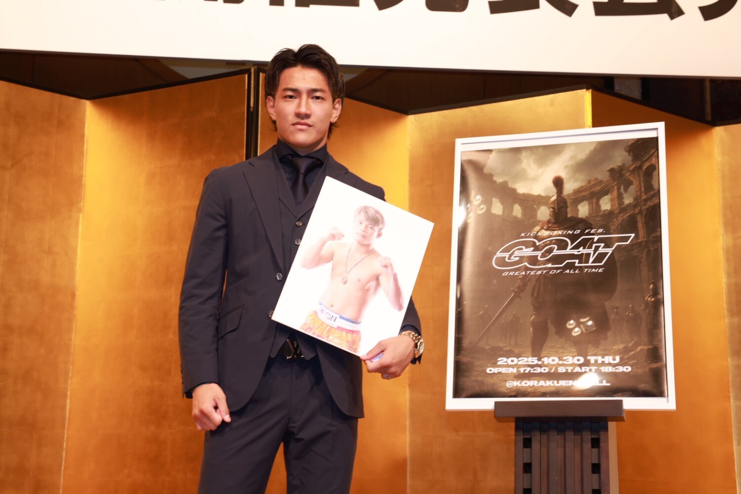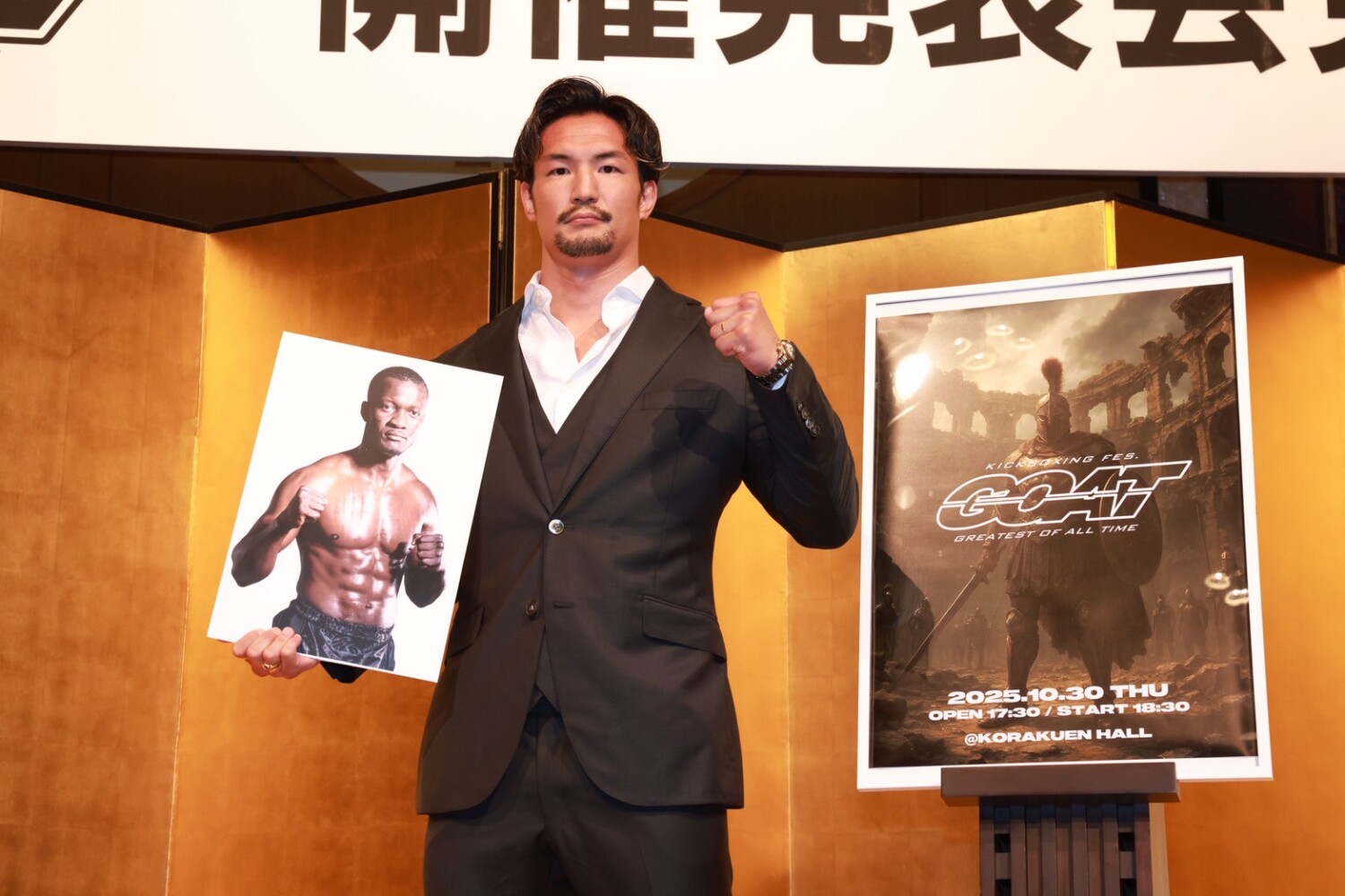 この地上波大会の実現に関わった皆様、ありがとうございます。子供の頃からテレビでK-1を見て育ったので、自分が地上波に出られることがすごくうれしいです。今、キックが盛り上がりに欠ける中で、地上波で多くの人に見てもらい、広げることが僕のやるべきことだと思っています。GOATを楽しみにしていてください。