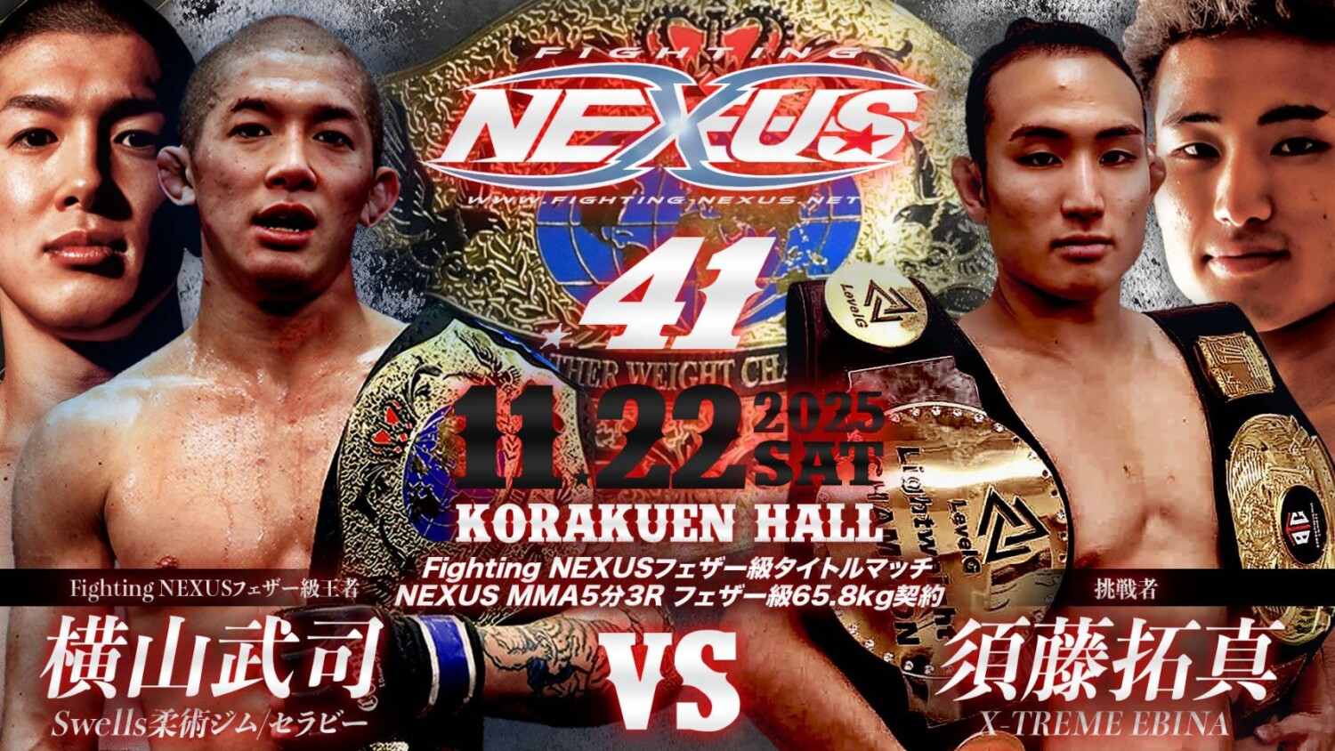 Fighting NEXUS 11.22 後楽園ホール:横山武司、フェザー級王座2度目の防衛戦は“レッグハンター”須藤拓真との寝業師対決
